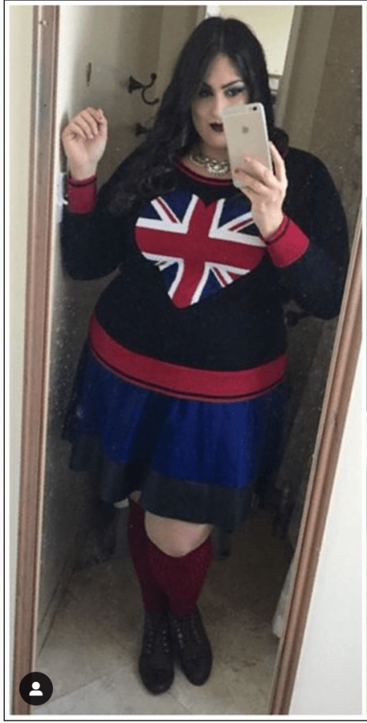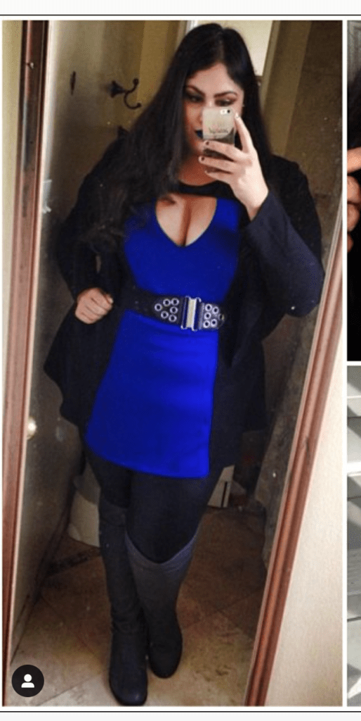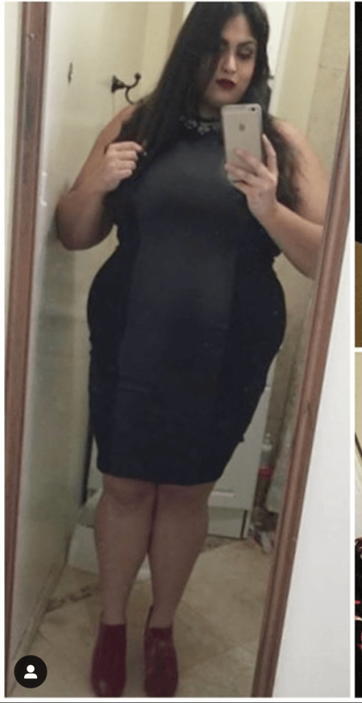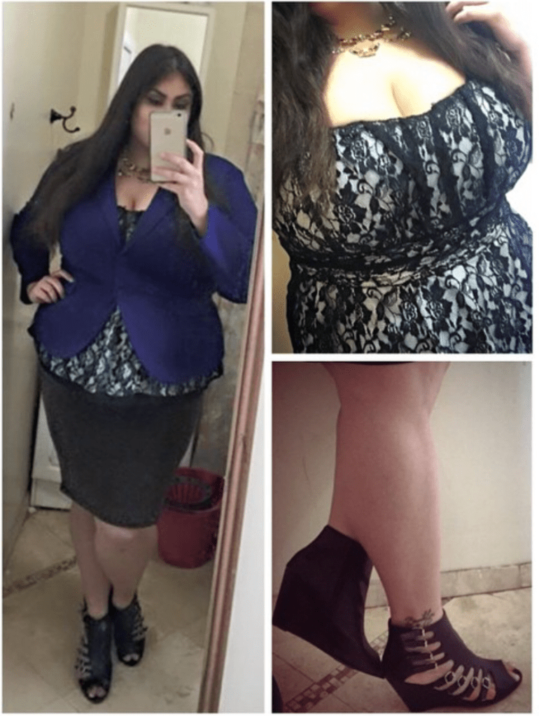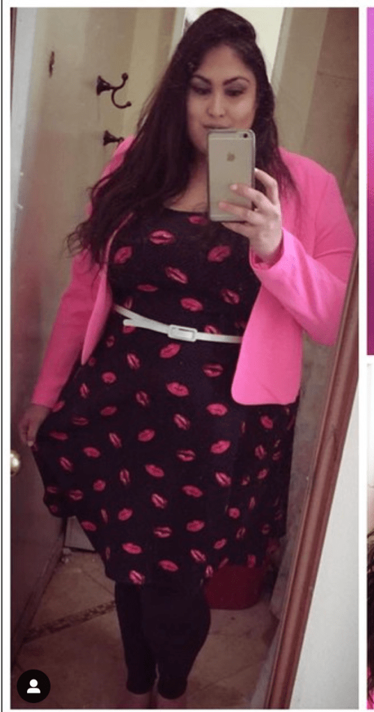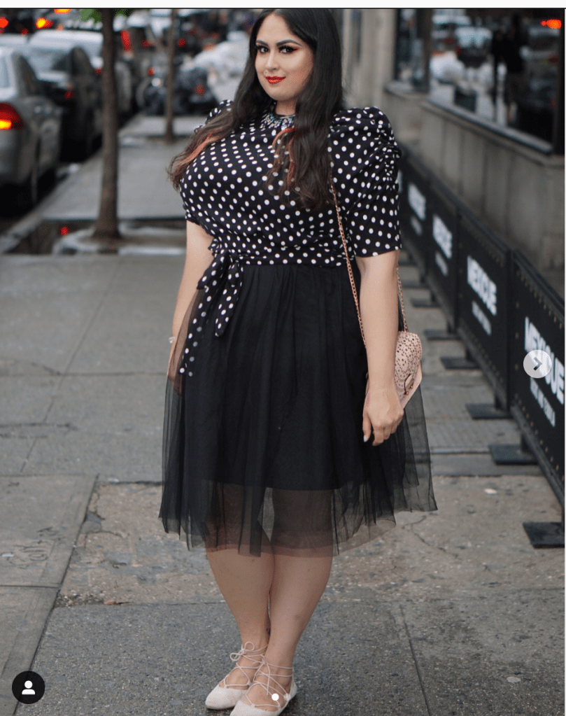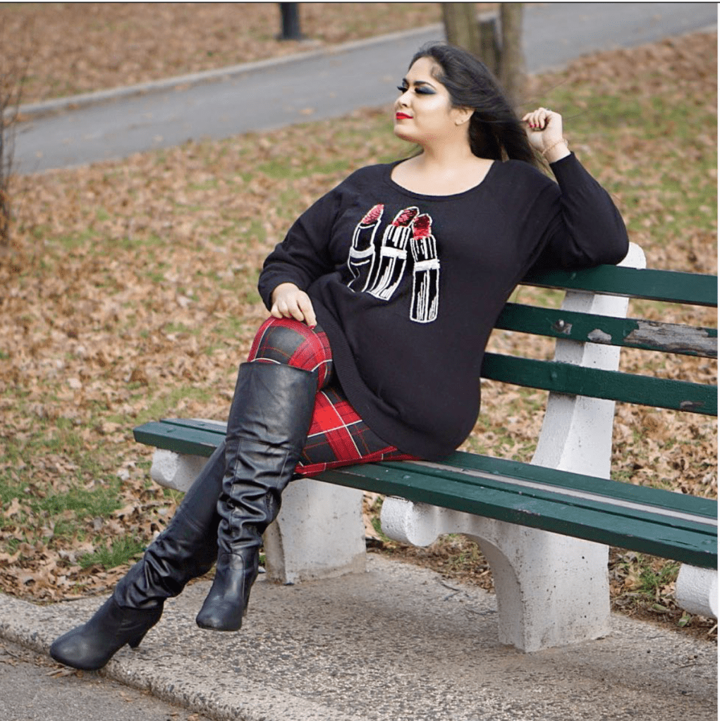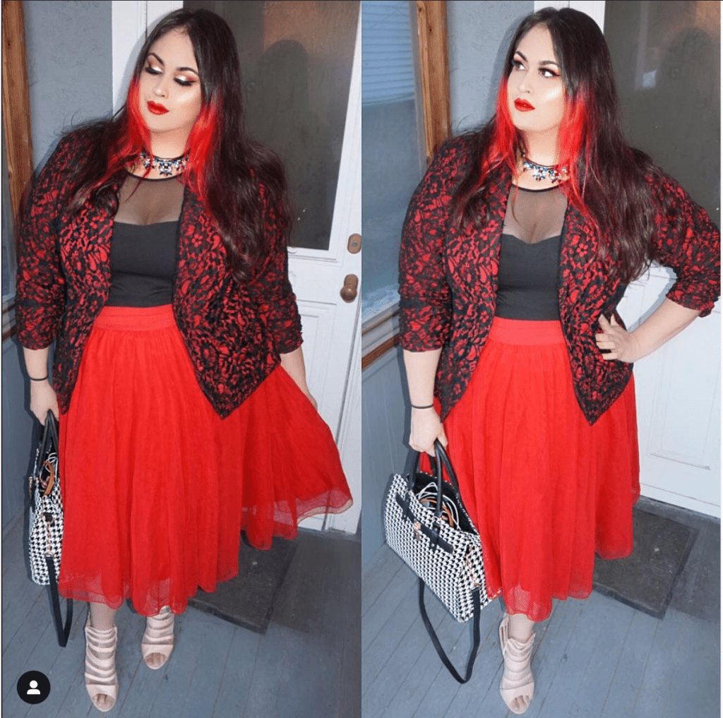 Nikki Apostolou is wearing an Ashley Stewart Vest and Skirt, Eloquii Belt, and Rainbow Shops Shoes.